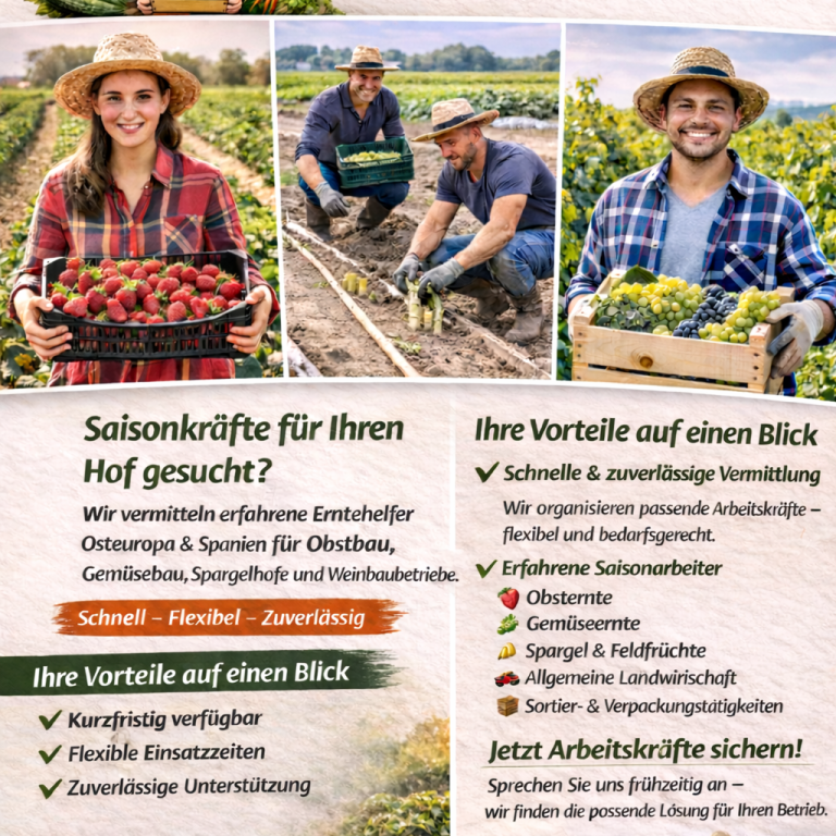 Unser Team arbeitet eng mit Ihnen zusammen, um maßgeschneiderte Lösungen für Ihren Personalbedarf zu bieten. Kontaktieren Sie uns für eine individuelle Beratung und erfahren Sie, wie wir Ihre Ernte effizient unterstützen.